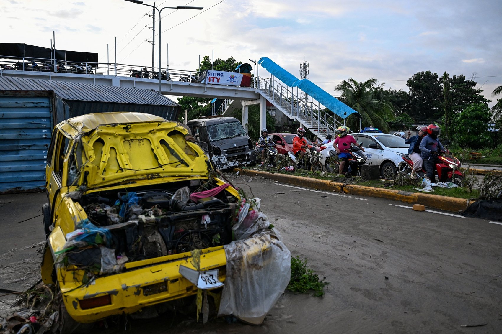 2025年11月5日,菲律賓宿務省曼達維市(Mandaue)遭颱風「海鷗」襲擊後,路邊隨處可見被洪水沖毀的車輛。(Jam Sta Rosa/AFP via Getty Images)