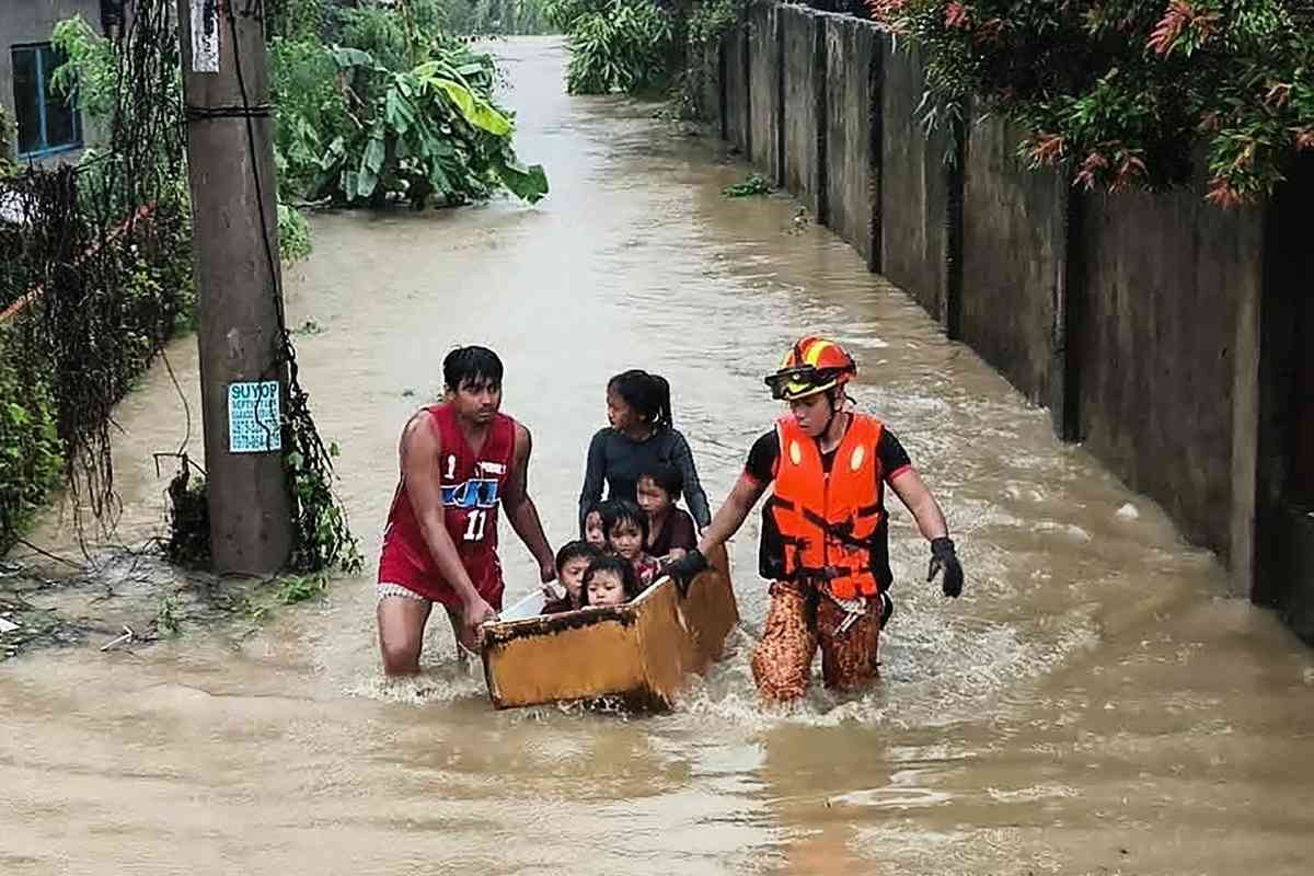 2025年11月4日,菲律賓宿務省托萊多市(Toledo City)遭颱風「海鷗」襲擊期間,救援人員協助洪水災民撤離家園。(Handout/ Bureau Fire Protection-Toledo CityY/AFP)