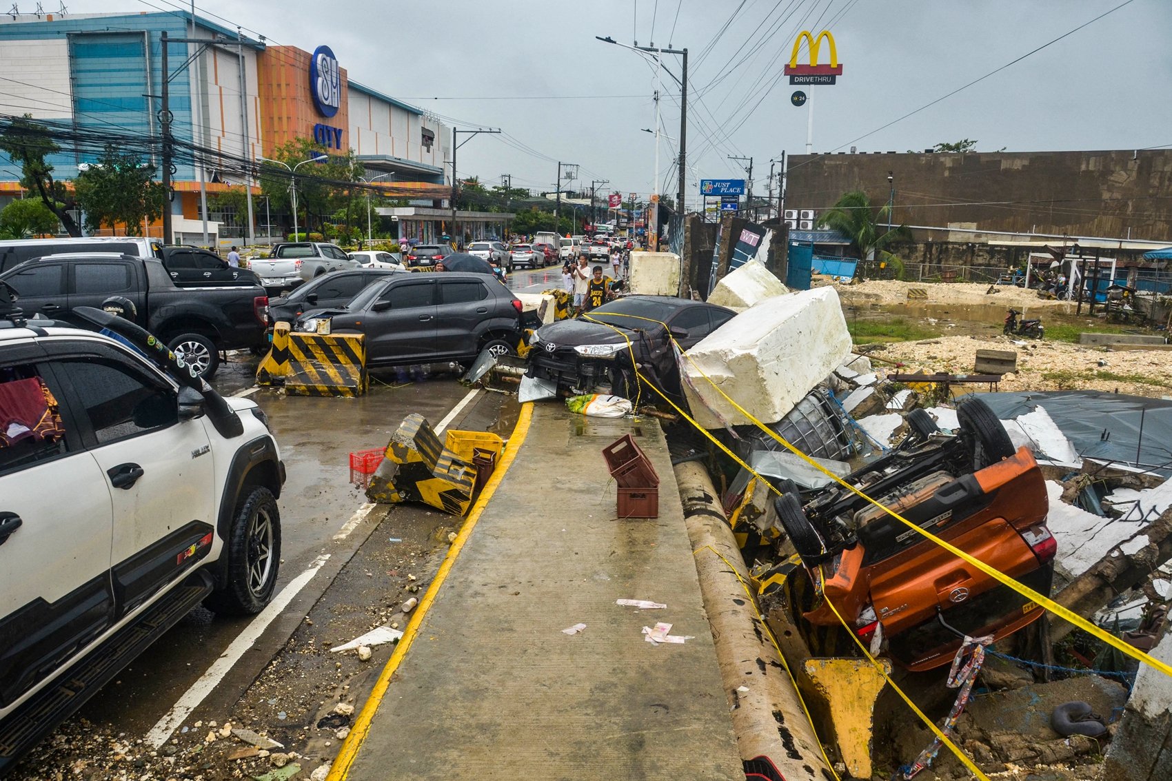 2025年11月4日,颱風「海鷗」來襲後,菲律賓宿務省索拉西翁鎮(Consolacion town)的街道上到處都是被洪水沖毀的車輛。(Alan Tangcawan/AFP via Getty Images)