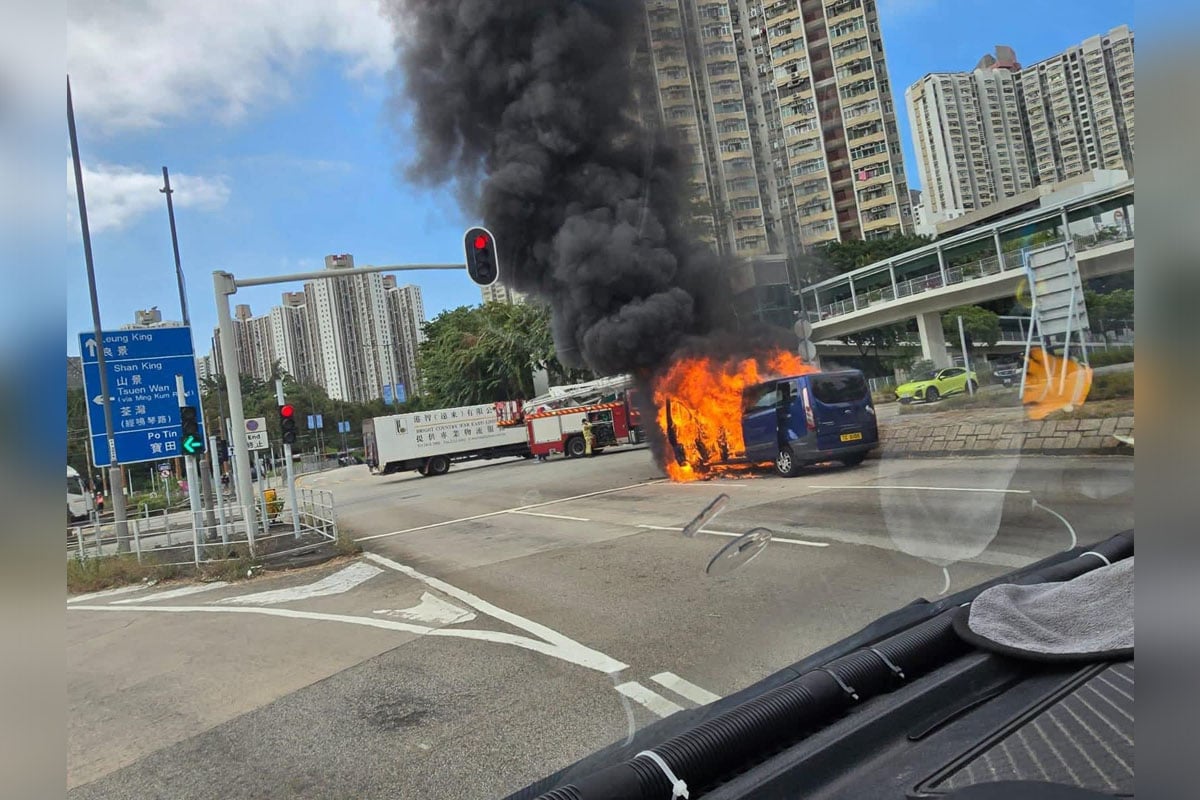 網上片段可見,涉事客貨車停泊在青田路與鳴琴路交界的燈位前,但全車已陷入火海,大量濃煙冒出。所幸事故中未有傷亡報告,起火原因有待調查。@
