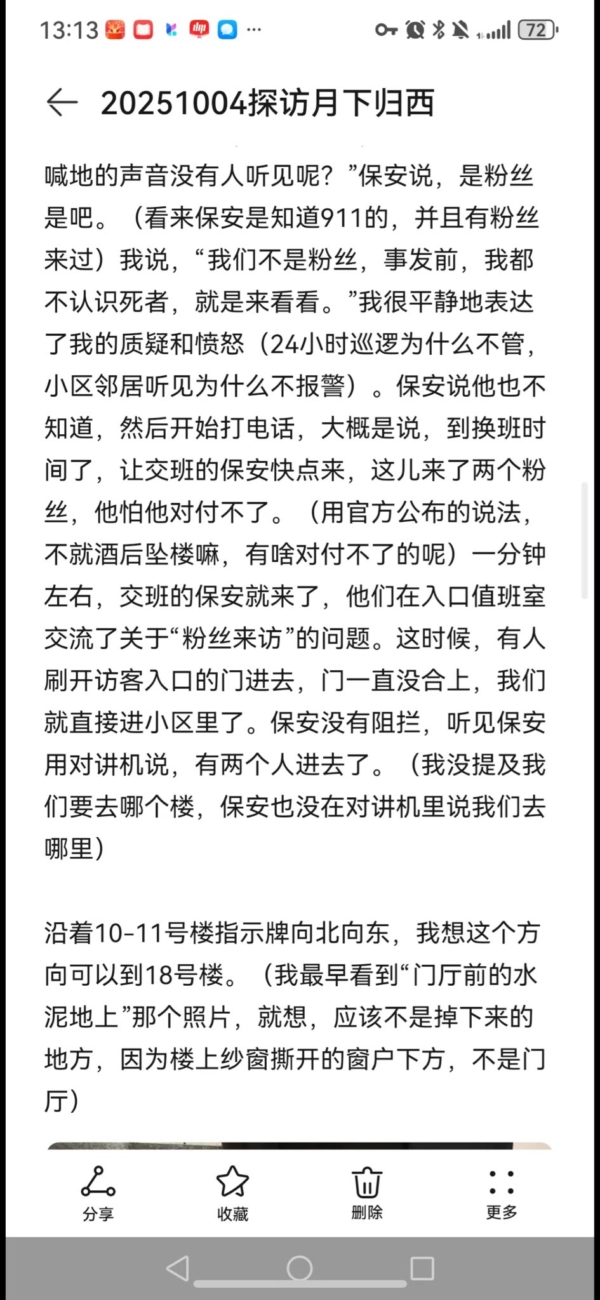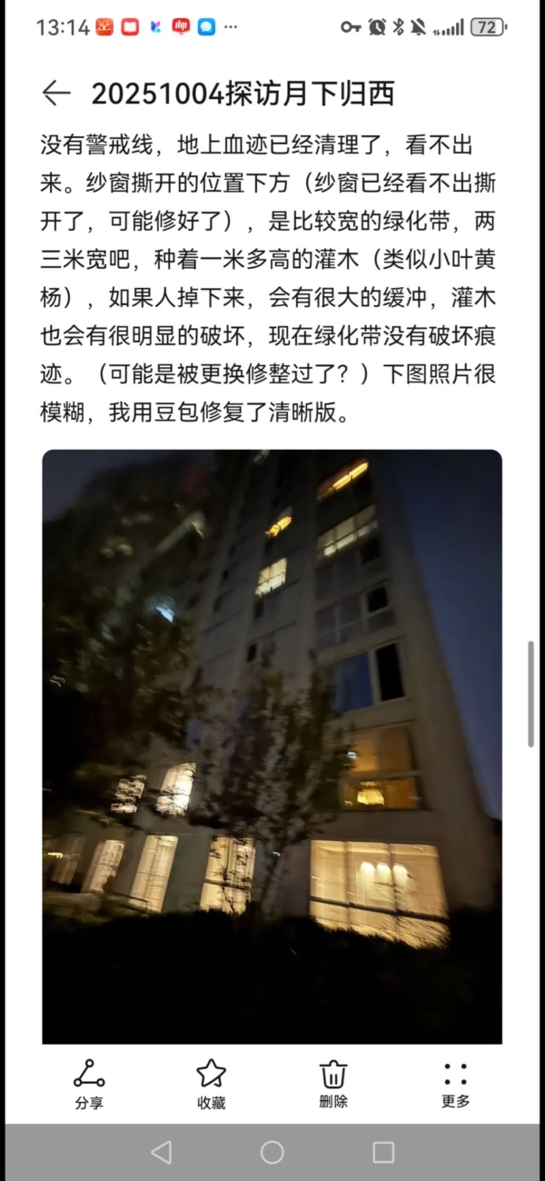 在此之前,也有于朦朧的大陸女粉絲在10月4日夜探陽光上東小區,並將經過發到網上。這名粉絲強調兩點:一是扯破的紗窗正下方正對著綠化帶,並非單元樓的門廳前;二是小區多名保安都沒有否認事發當晚「小區裏有哭天喊地的聲音(指慘叫聲)」。