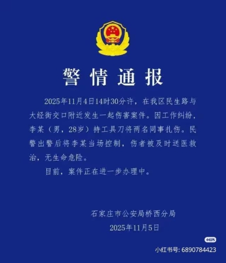 11月5日上午河北石家莊市公安局橋西分局發布警情通報稱,「11月4日14時30分許,在我區民生路與大經街交口附近發生一宗傷害案件。因工作糾紛,李某(男,28歲)持工具刀將兩名同事扎傷。民警出警後將李某當場控制,傷者被及時送醫救治,無生命危險。目前,案件正在進一步辦理中。」