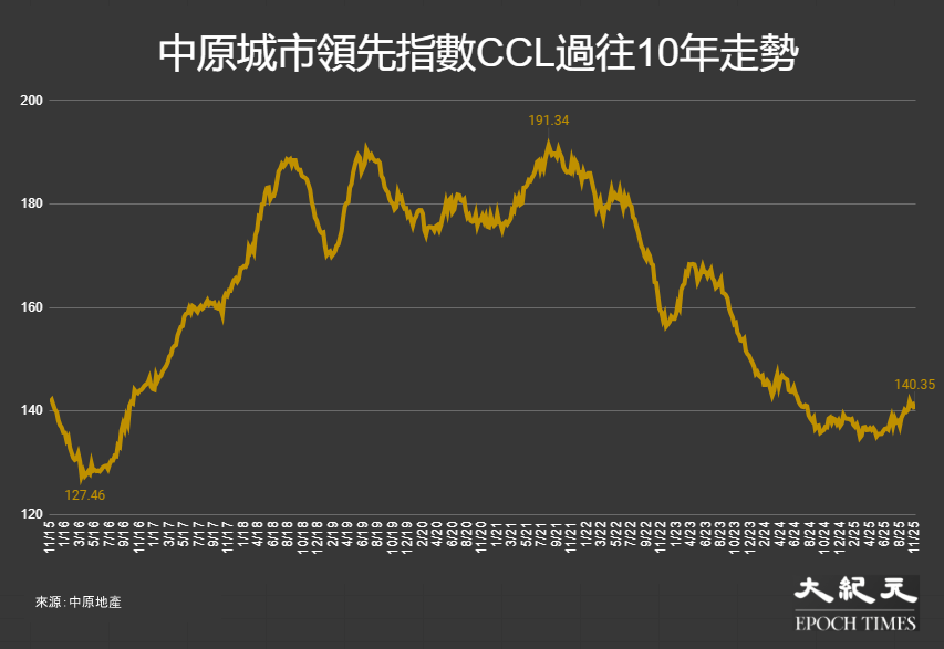 追蹤香港二手樓價的中原城市領先指數CCL於7日公布最新的數值為140.35點,截至11月2日,按周指數下降0.67%,按月則升0.06%,自疫情爆發以來(2020年1月26日起)跌20.97%,而3年的累積跌幅為14.89%。大型、中小型單位按周分別錄得下降1.27%、降0.55%,3年累積跌19.11%、跌13.98%。