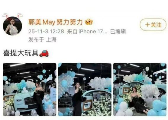 11月3日,郭美美在其微博帳號「郭美May努力努力」炫富,發了一張勞斯萊斯新車的圖片。