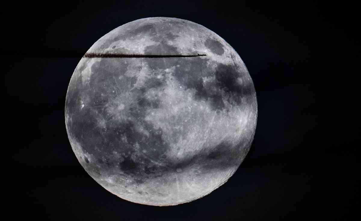 2025年11月5日,一架飛機從奧地利維也納上空出現的滿月前飛過。(Georg Hochmuth/APA/AFP via Getty Images)