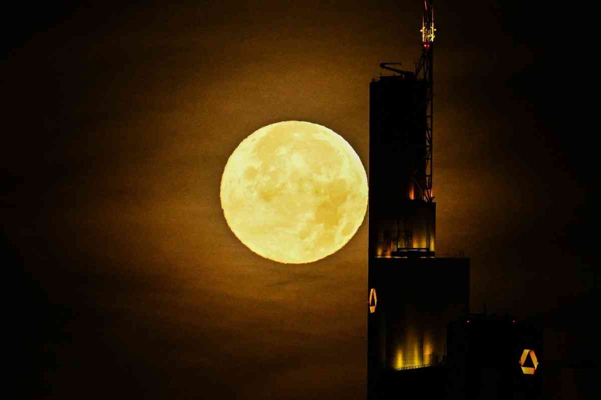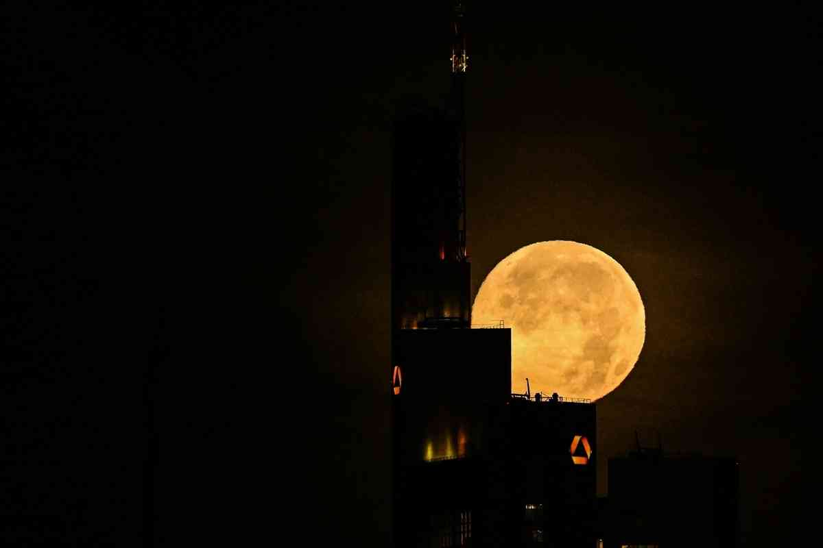 2025年11月5日,一輪超級月亮從法蘭克福德國商業銀行大廈的後方緩緩升起。(Kirill Kudryavtsev/AFP via Getty Images)