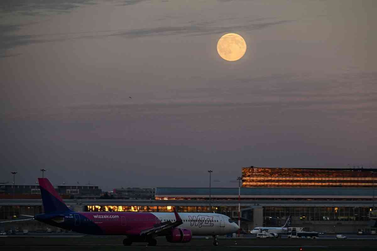 2025年11月5日,波蘭華沙蕭邦機場(Chopin Airport)上空出現的超級月亮。(Sergei Gapon/AFP via Getty Images)