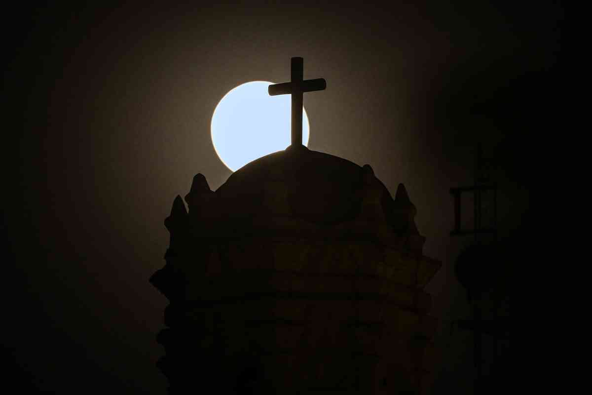 2025年11月5日,一輪皎潔的圓月從墨西哥城聖維拉克魯斯教堂(Santa Veracruz Church)的圓頂後方升起。(Yuri Cortez/AFP via Getty Images)