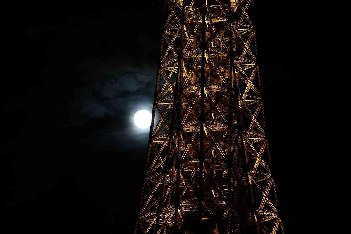 2025年11月5日,一輪皎潔的圓月從巴黎埃菲爾鐵塔後方緩緩升起。(Thibaud Moritz/AFP via Getty Images)