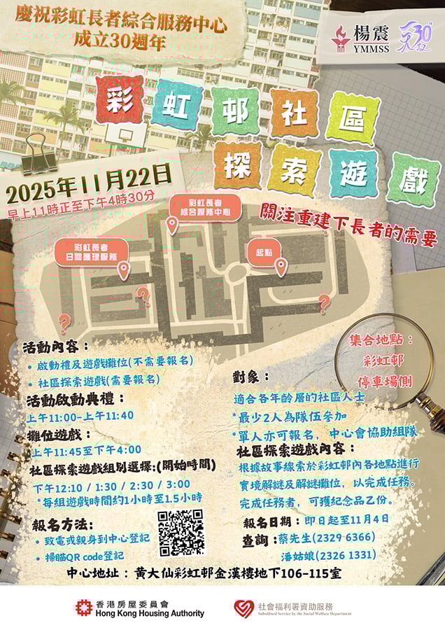 循道衛理楊震社會服務處(楊震)彩虹長者綜合服務中心適逢30周年誌慶,將於11月22日舉行「彩虹邨社區探索遊戲」,費用全免。活動分設4個不同時段,每節遊戲時間約一小時,參加者須根據派發的故事線索,遊走整個彩虹邨,在指示的7個「解謎攤位」中,進行「實境解謎」,完成後可獲發紀念品一份。在過程中,參加者可深入認識彩虹邨,了解邨內居民需要,還能感受鄰里之間的人情味。玩完解謎遊戲後,還可以參加大會在彩虹邨停車場側設置的多個攤位遊戲。