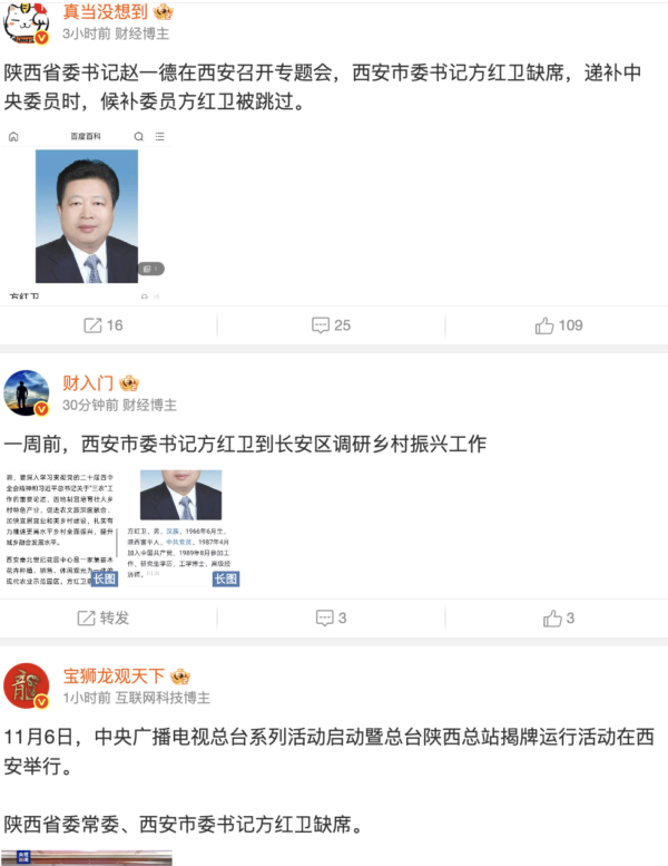 11月6日,多個大陸微博大V發帖稱,陝西省委常委、西安市委書記方紅衛缺席多次活動,暗示其已出事。