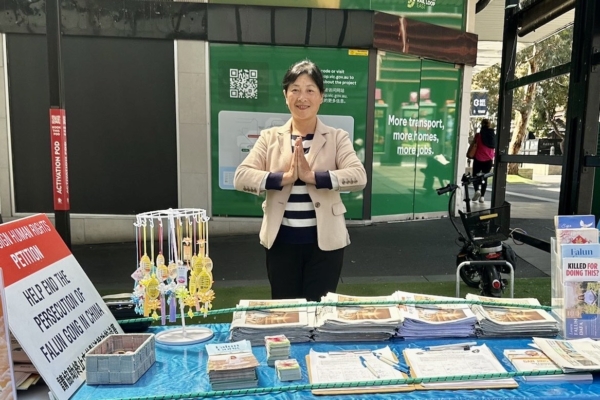 上午十點左右,劉連偉和義工們再次來到Box Hill購物中心前的法輪功真相點。一切如常,輪迴著熟悉的節奏——依舊是那樣的陽光,透過檸檬桉樹的葉隙灑落在地,斑駁而溫柔;依舊是那灰色的鴿子,成群飛起又輕落,在行人路上悠然踱步。依舊是那些動作:立起桌子,鋪上桌布,擺好資料,拉開展板。幾人靜靜地演示功法,動作緩慢而流暢;幾人面帶微笑,熱心地分發報紙與傳單。