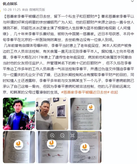 該帳號還引述知情人士稱,李春平2017年左右患上遺傳性老年痴呆症,病發前他和親屬簽字同意由女友擔任監護人管理其數十億財產。