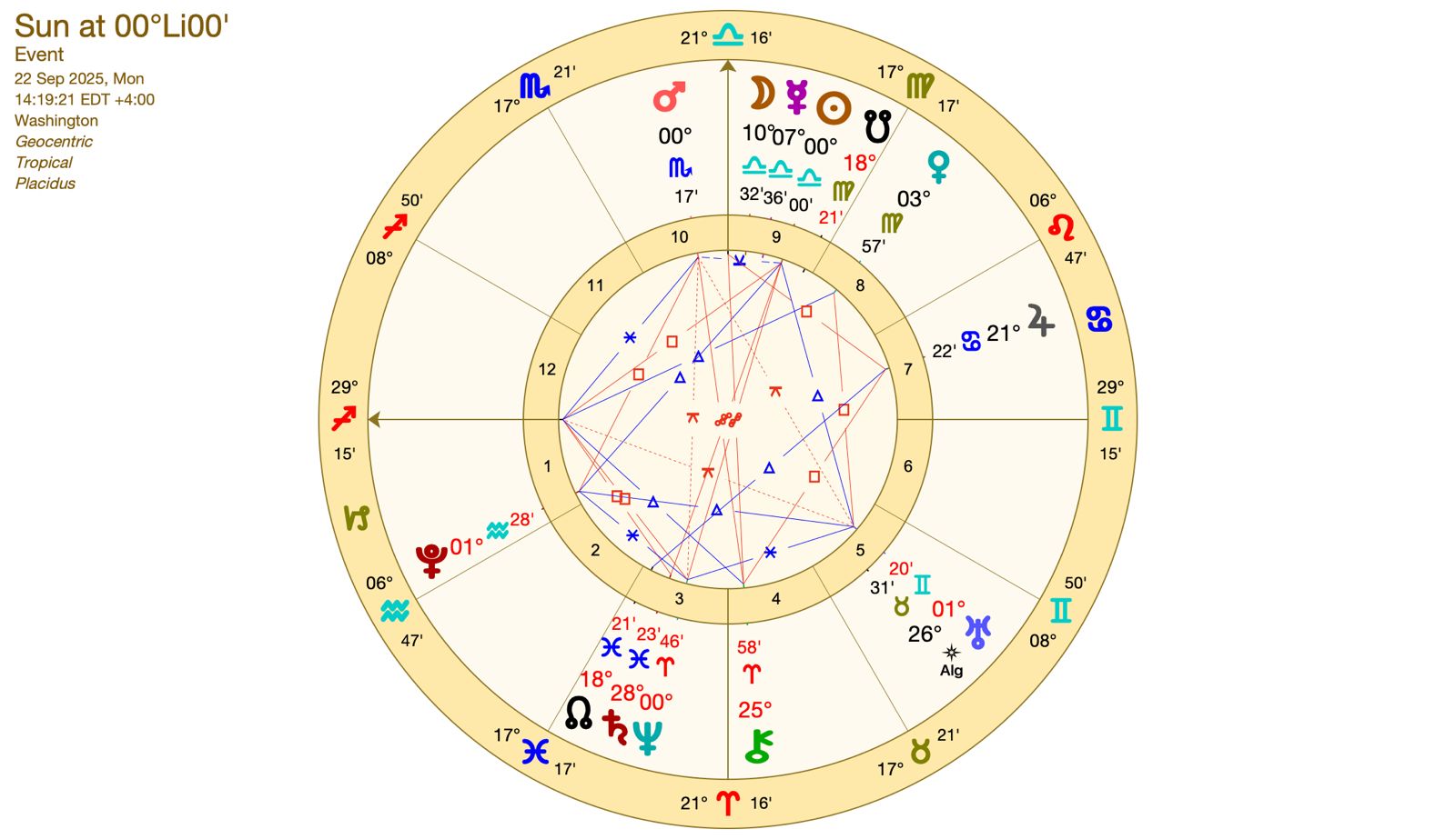 雖然現已距離秋分(9月22日)超過七星期,但從當時的秋分盤所呈現的結構來觀察,仍能為當前美國的整體局勢提供一定的參照價值。