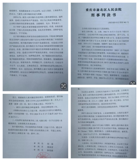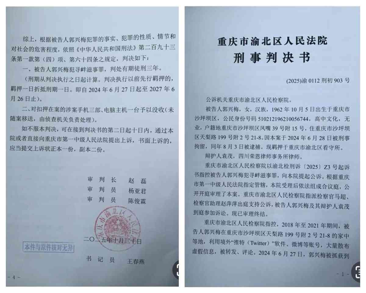 判決書稱,重慶市渝北區人民檢察院指控,2018年至2021年期間,郭興梅在重慶市沙坪壩區家中,利用境外「推特(Twitter)」軟件、微博等賬號,大量散布虛假資訊,被轉發、評論。2024年6月27日,郭興梅被拘捕到案,2024年6月28日被刑事拘留,同年8月3日被逮捕。提請法院依法判處。2025年10月30日,郭興梅被以所謂的「尋釁滋事罪」判刑三年。
