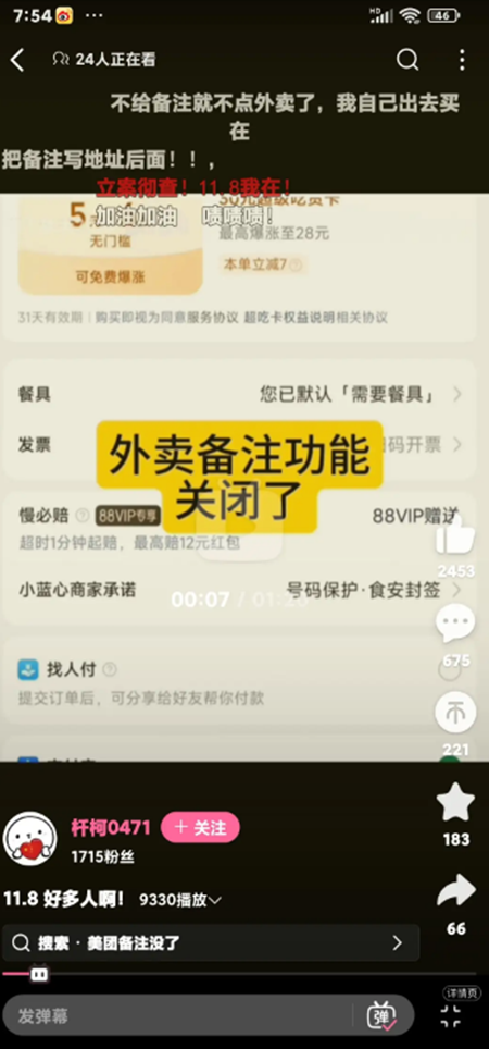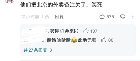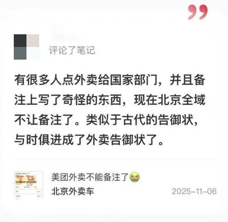 有網民表示,「在北京點外賣,所有的外賣平台備註欄全都被取消了。」「有很多人點外賣給國家部門,並且備註上寫了奇怪的東西,現在北京全域不讓備註了。類似於古代的告御狀,與時俱進成了外賣告御狀了。」