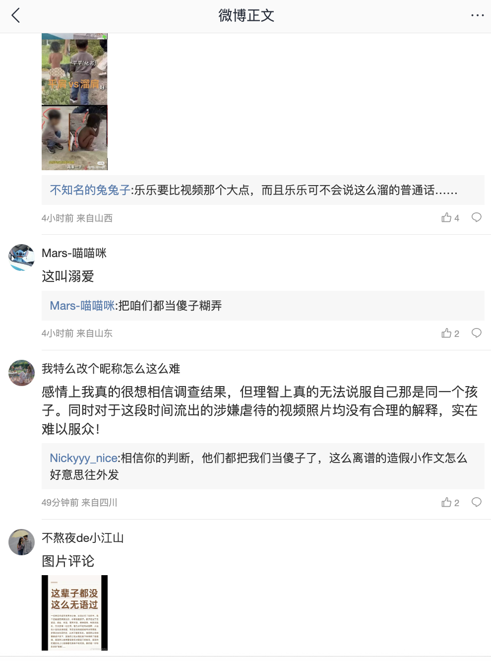 網民說:「把我們當猴耍呢,我們不瞎,根本就不是同一個人」「有眼珠子的都知道是假的」「孩子,媽媽,姥爺都不是同一個人」「樂樂(指野小孩)要比影片那個大點,而且樂樂可不會說這麼溜的普通話……」
