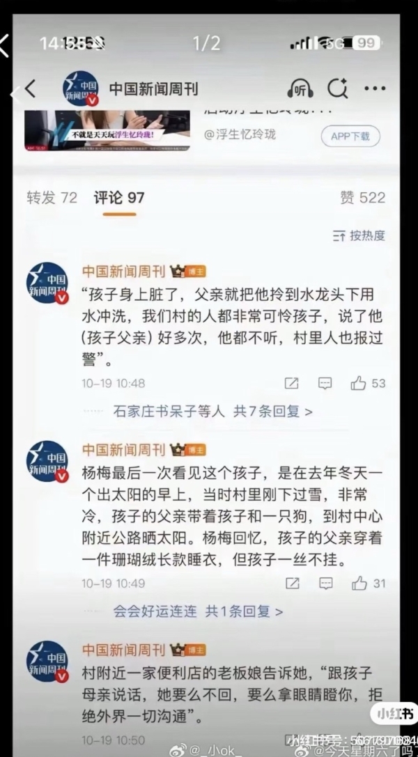 中共官媒《中國新聞周刊》10月19日曾報道,據村民說,冬天很冷,孩子父親拎著孩子到水龍頭下沖洗,村民勸說無效,多次報過警,還有一次是在冬天的早上,剛下過雪,孩子父親穿珊瑚絨長款睡衣,帶著孩子和一隻狗,孩子「一絲不掛」。◇