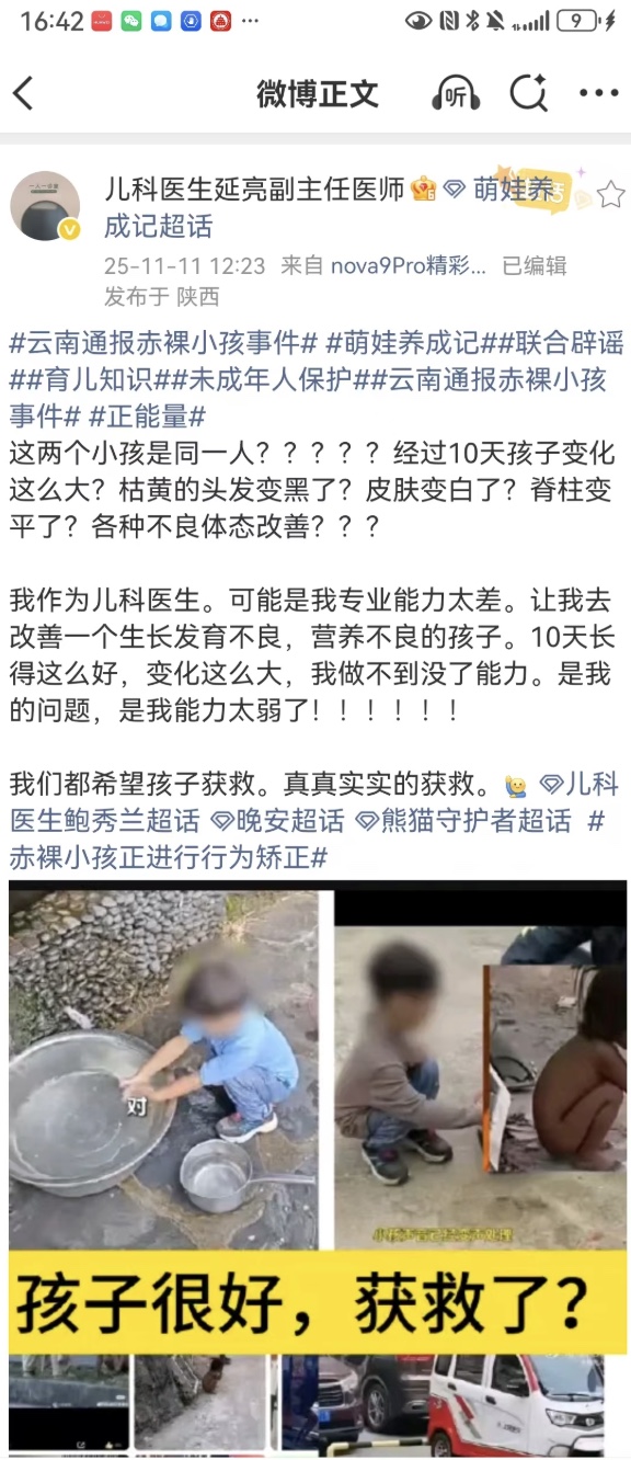 微博帳號「兒科醫生延亮副主任醫師」發帖質疑:「這兩個孩子是同一個人?經過10天孩子變化這麼大?枯黃的頭髮變黑了?皮膚變白了?脊柱變平了?各種不良體態改善?」