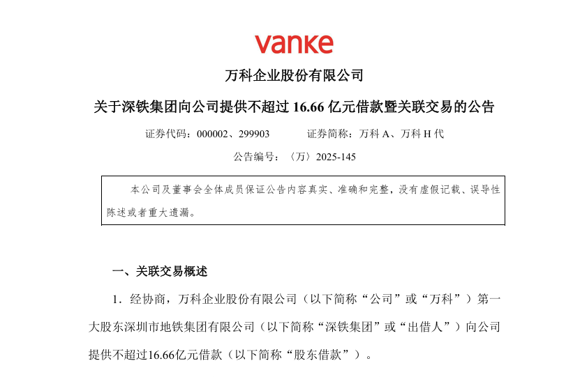 萬科在11日的《關於深鐵集團向公司提供不超過16.66億元借款暨關聯交易的公告》中表示,深鐵集團提供的16.66億元借款用於償還公司在公開市場發行的債券本金與利息。借款期限不超過3年。雙方商定借款可提前還款;經出借人同意,可進行展期。借款利率定價基準為每筆借款提款日前一工作日全國銀行間同業拆借中心公布的1年期貸款市場報價利率(LPR),浮動點數為減66個基點,目前為2.34%。