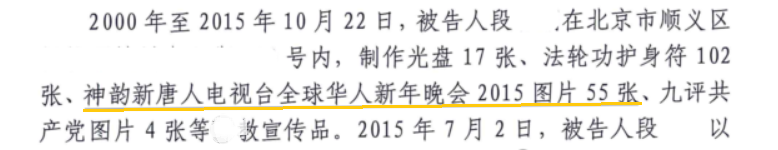 北京市順義區法院2017年的一份判刑書顯示,一名段姓法輪功學員被非法判刑一年半。法庭文件上顯示的判決依據是,在2000年至2015年的15年間,該男子製作了17張法輪功光碟、55張新唐人電視台2015年新年晚會(即「神韻晚會」)圖片、4張《九評共產黨》圖片,以及102個與法輪功相關的護身符。這些都成為了他被迫害的「罪證」。