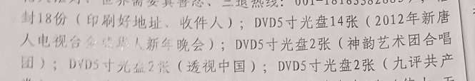 甘肅隴西縣法院2013年的一份判決書顯示,一名陳姓法輪功學員被冤判三年六個月。法庭文件上顯示被作為證據的扣押物品中,除有大法書籍、真相幣等資料外,有5寸DVD光碟14張(2012年新唐人電視台全球華人新年晚會),5寸DVD光碟2張(神韻藝術團合唱團演唱會)等。