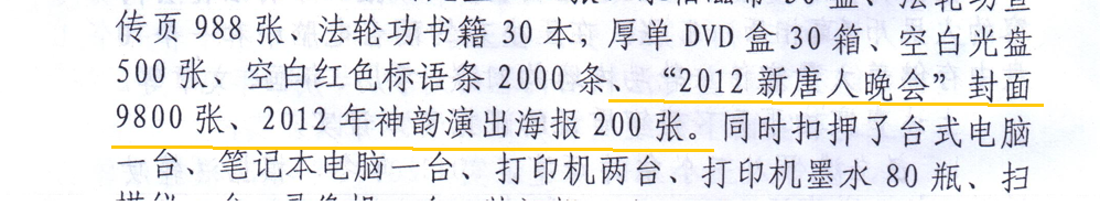 河北泊頭市法院2012年的一份判決書顯示,一名王姓法輪功學員被非法判刑三年。法庭文件上顯示的證據中,除了法輪功書籍、「真、善、忍」掛圖等,與神韻相關的證據包括《2012年新唐人晚會》光碟100張,《2012年新唐人晚會》封面9,800張、2012年神韻演出海報200張等。