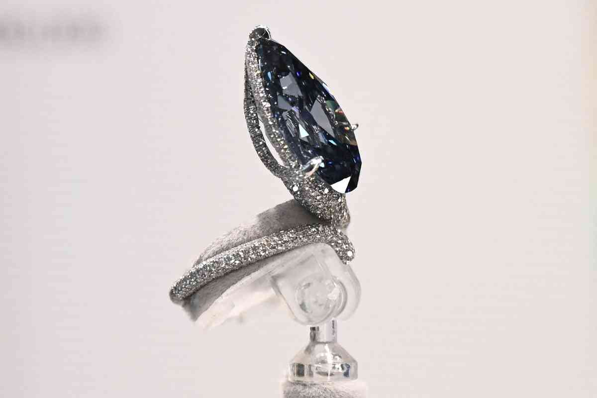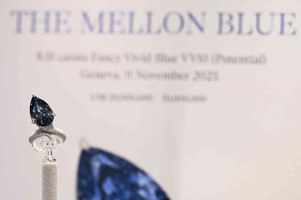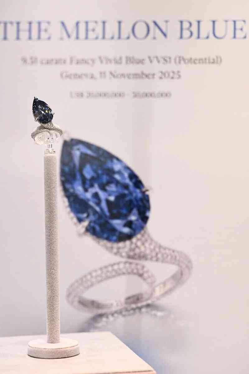 2025年11月7日,瑞士日內瓦,佳士得拍賣行(Christie's)展示一顆重達9.51卡的「梅隆藍鑽」(Mellon Blue)。(Valentin Flauraud/AFP via Getty Images)