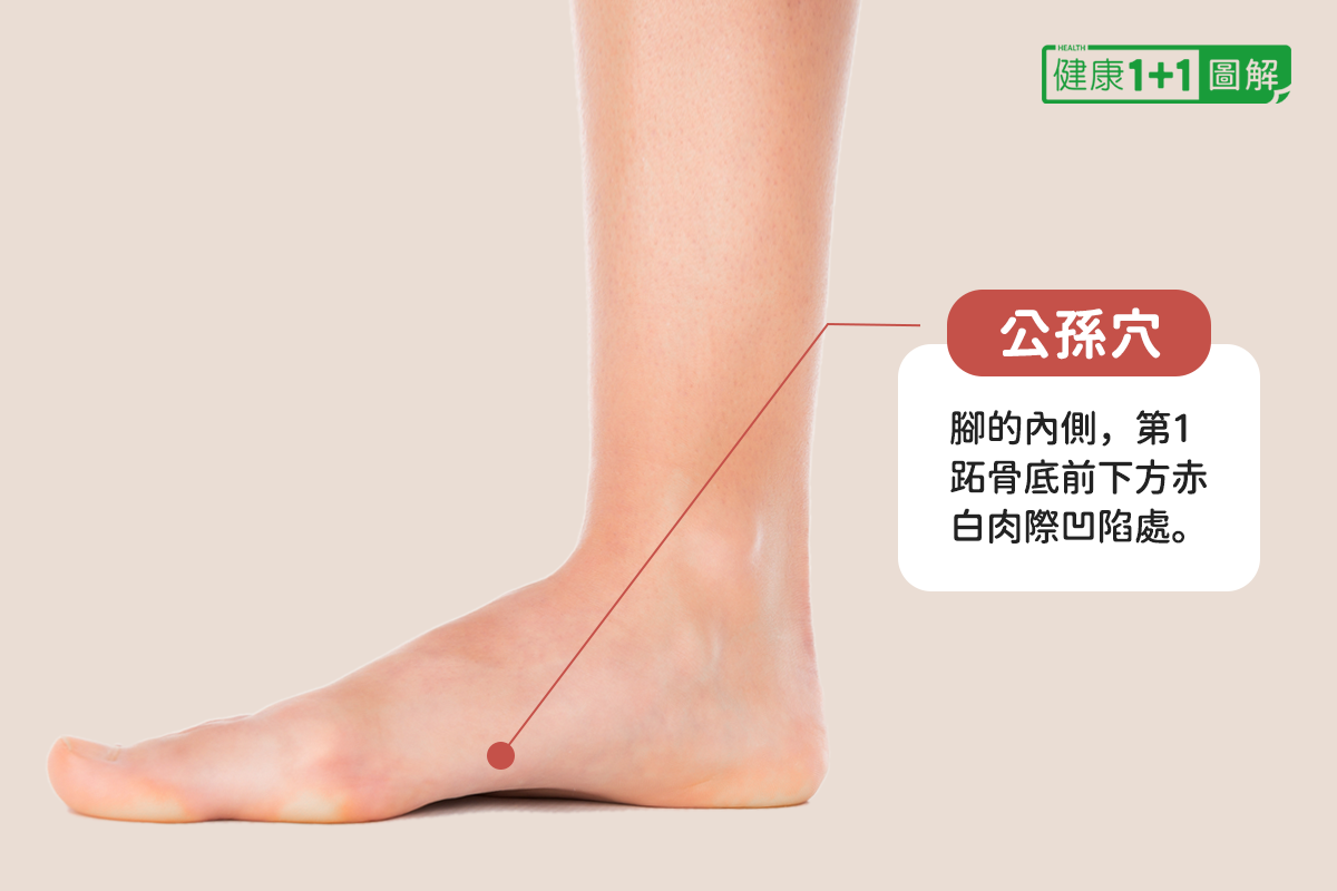位置:先找到腳大拇指關節後方的凹陷處,然後沿著腳掌內側緣向後約一根大拇指橫寬的距離,在緊貼著腳掌骨頭(蹠骨)的下方凹陷處就是公孫穴。