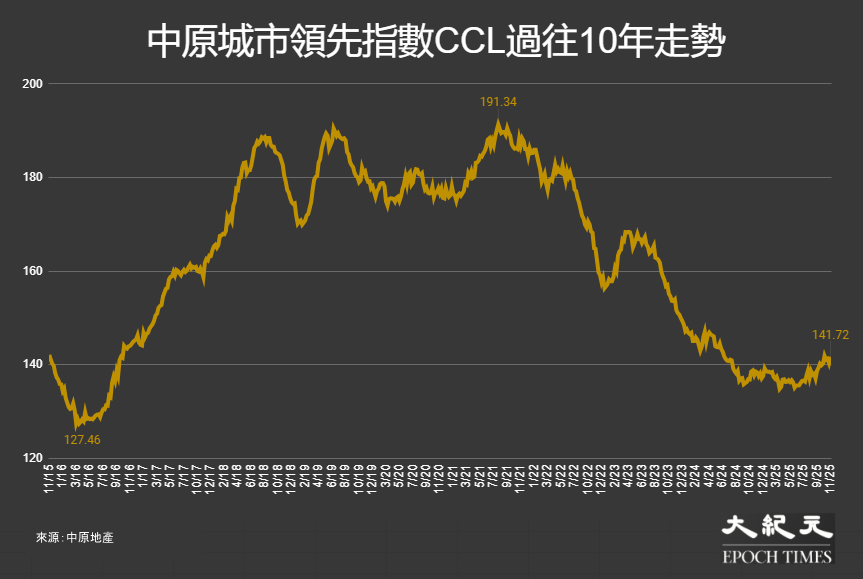 追蹤香港二手樓價的中原城市領先指數CCL於14日公布最新的數值為141.72點,截至11月9日,按周指數上升0.98%,按月則跌0.14%,自疫情爆發以來(2020年1月26日起)跌20.19%,而3年的累積跌幅為13.99%。大型、中小型單位按周分別錄得上升1.49%、升0.88%,3年累積跌18.14%、跌13.09%。
