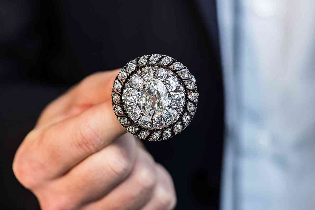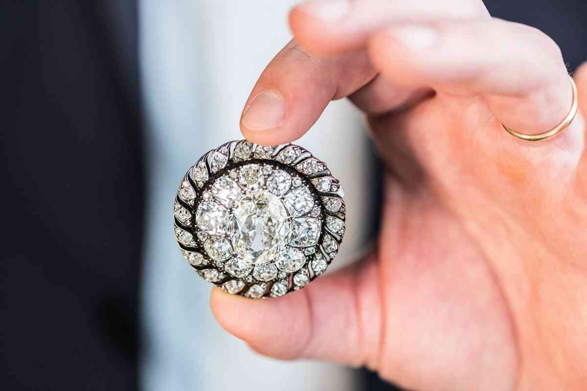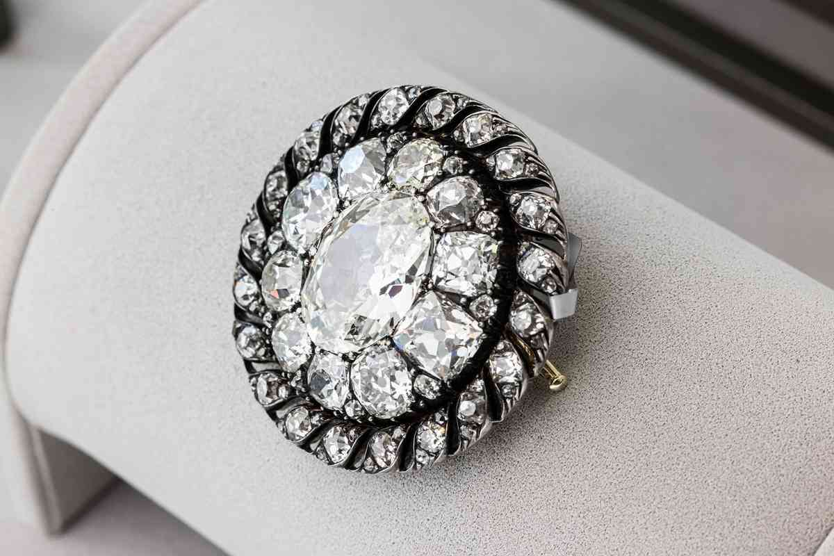 這枚銀白色的圓形胸針兼具胸針與吊墜功能,中間鑲嵌著一顆超過13卡重的橢圓形鑽石,周圍環繞著近百顆切割精緻的小鑽石。過去兩個多世紀以來,這枚胸針一直被普魯士王室霍亨索倫家族當成傳家寶。