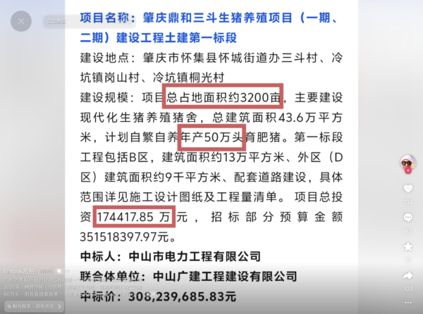 這場衝突的核心是一項名為「肇慶鼎和三斗生豬養殖項目」的大型工程。該項目規劃總佔地面積約3200畝,涉及懷集縣懷城街道辦三斗村、冷坑鎮崗山村及冷坑鎮桐光村三個村莊,計劃建設年產50萬頭育肥豬的現代化養殖設施,項目總投資超過17億元。