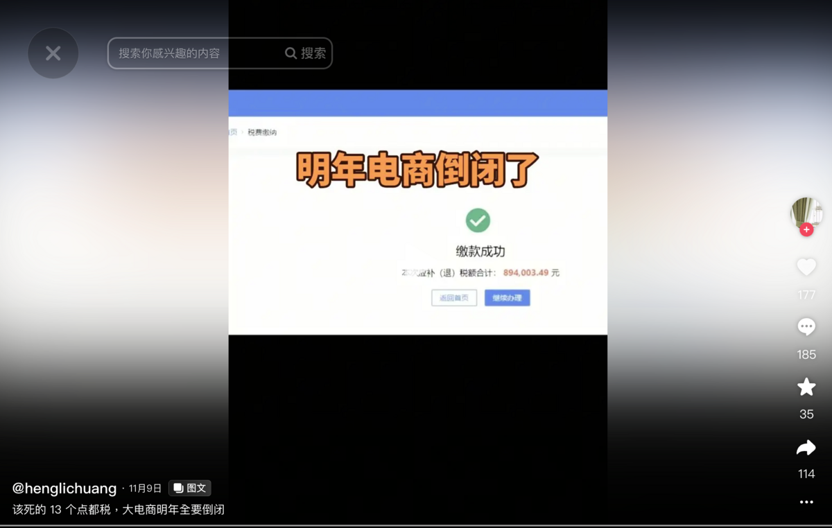 一位商家發布繳稅成功的截圖表示,「該死的13個點稅,大電商明年全要倒閉。」