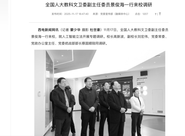 西安電子科技大學官網西電新聞網11月17日發消息稱,當天,「全國人大教科文衛委副主任委員景俊海一行來校,就人工智能立法開展專題調研。校長高新波,副校長劉宏偉,黨委常委、黨政辦公室主任、黨委統戰部部長蔡固順陪同調研。」