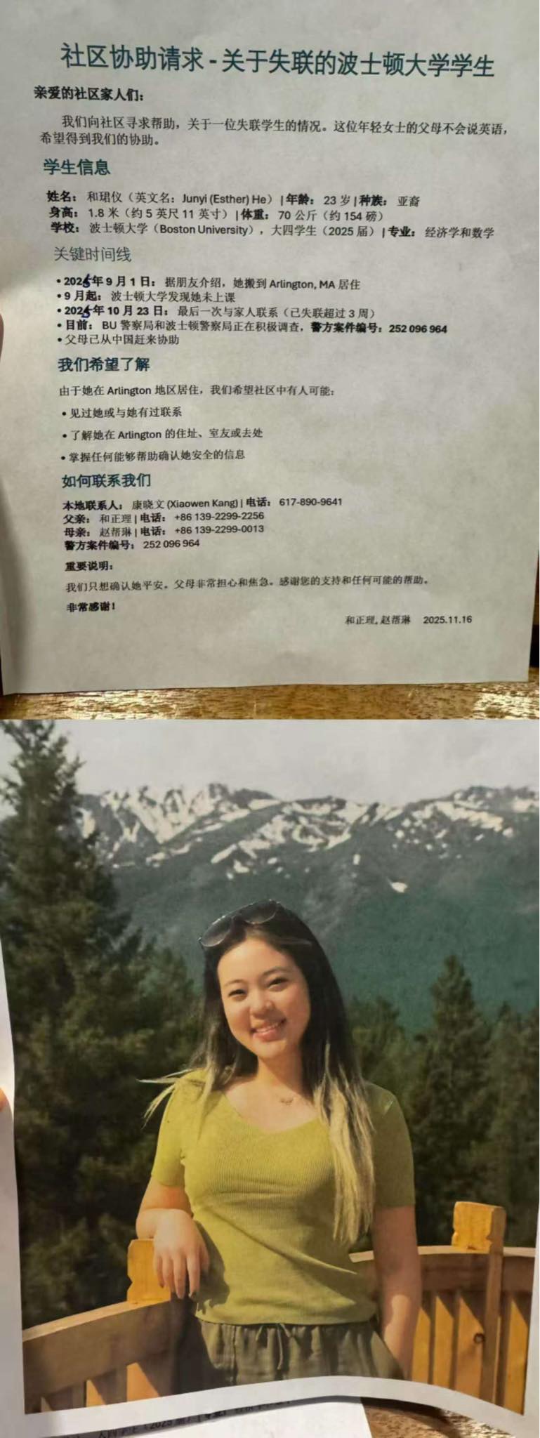 9月起,波士頓大學發現她未到校上課,10月23日為她與家人的最後一次聯繫,目前已失聯超過3周。當地警方正積極調查。和珺儀的父母已從中國趕至美國。