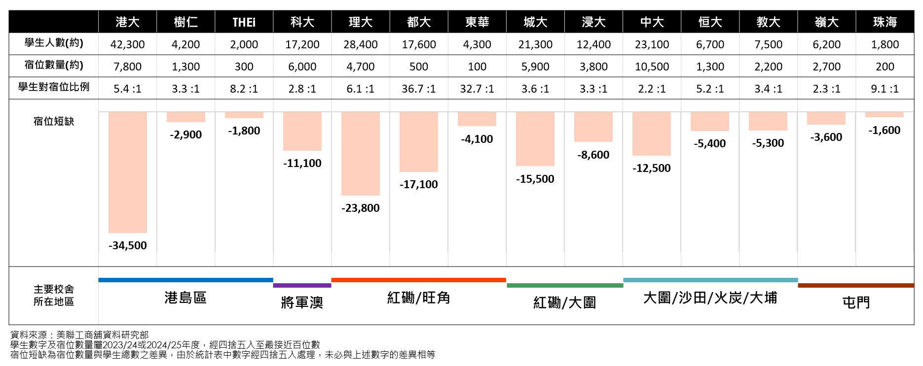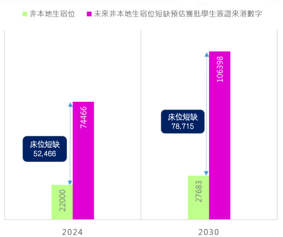 強勁的市場需求背後,是香港長期以來嚴峻的宿位短缺問題。綜合政府數據顯示,2024年本港大學宿位短缺已超過5.2萬個,多間大學的學生與宿位比例嚴重失衡。與此同時,政府自2024/25學年起放寬非本地生收生限額,資助大學的非本地生比例上限將逐步提升至50%。在新政策下,預計未來六年內,非本地學生人數將從現時的12.2萬人大幅增加至15.4萬人。然而,大學宿位供應增長緩慢,預計至2030年,僅計及非本地生的宿位缺口將擴大至近7.9萬個,為市場提供了龐大且明確的剛性需求。