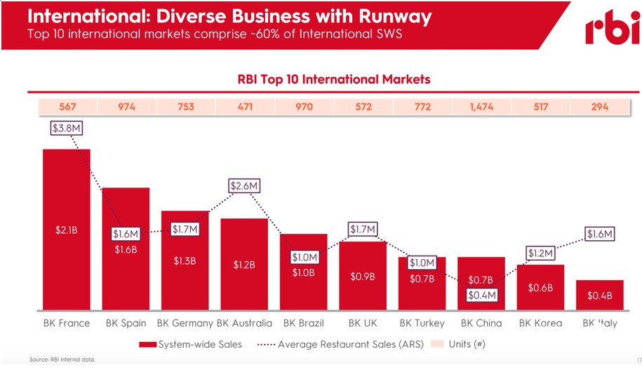 除了門店數量未能達標外,更糟糕的是門店的收入。2024年財報顯示,在RBI全球十大市場中,中國單店平均年銷售額僅40餘萬美元,處於墊底的位置。相比之下,法國店均銷售額為380萬美元,連倒數第二的巴西和土耳其也達到了100萬美元(見下圖)。2024年,漢堡王中國貢獻了3,700萬美元特許權使用費,但其中1,800萬美元被記為「壞賬」(未收回),直接拖累RBI集團的年度營業收入(AOI)。