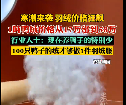 中國鴨絨價格近來漲到了一噸58萬元(人民幣,下同),這意味著,隨著冬天來臨,羽絨服價格會再次上漲。但也有很多網民對此表示不贊同。該消息衝上了熱搜。