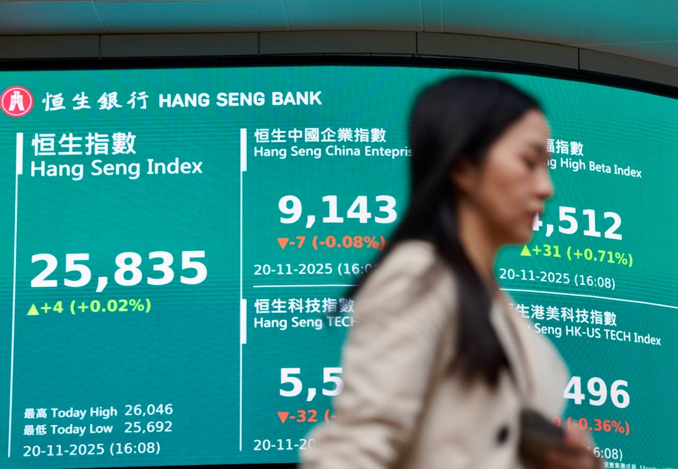 美股昨晚靠穩,內地A股疲弱,港股接近持平。恒指今(20日)早高開169點,盤中曾升至216點,午市回落,低位跌138點,最終收市報25,835點,微升4點,成交額2,451億。國指跌0.1%、科指走低0.6%。