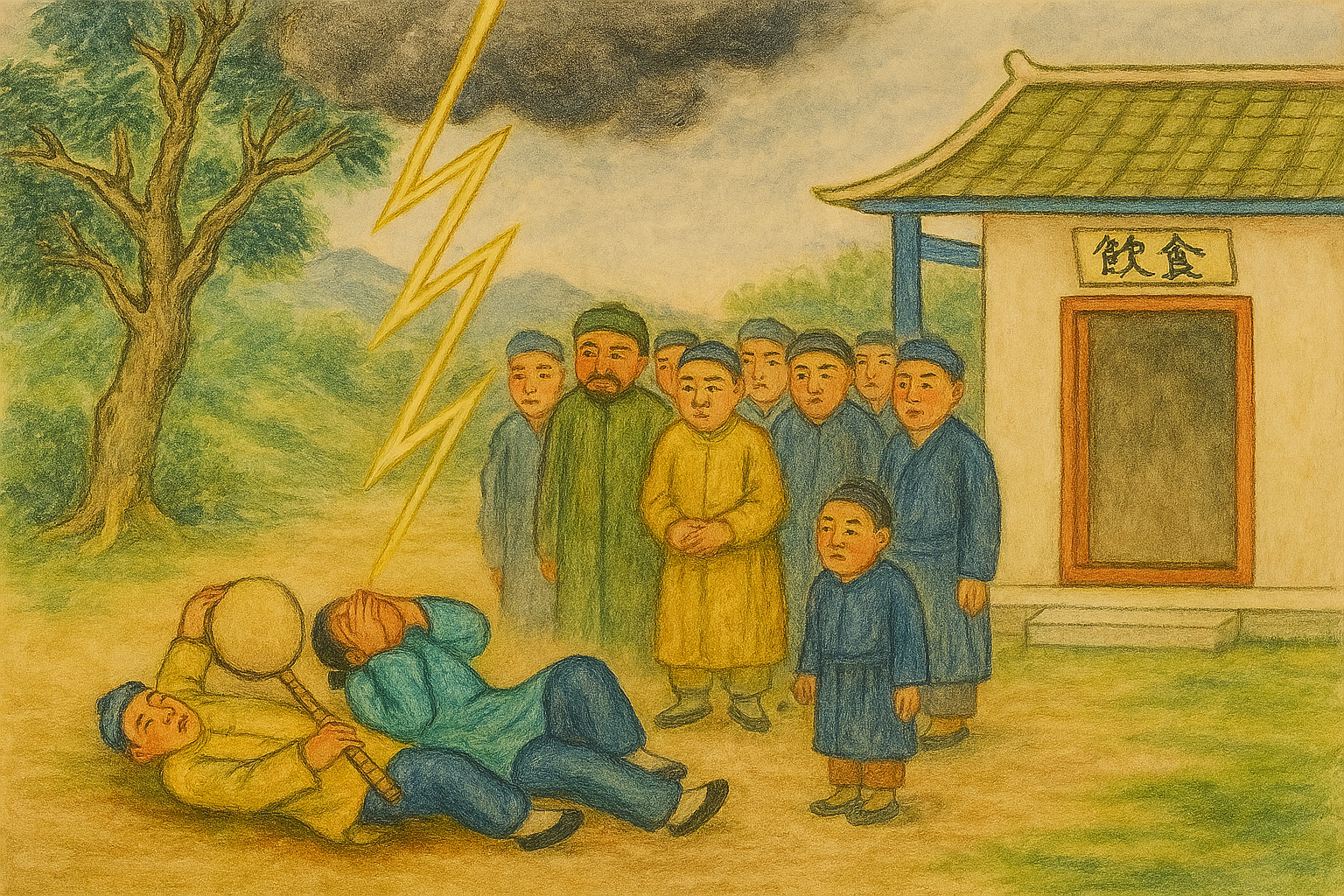 就在他倆人剛走出肉店幾步時,突然霹靂一聲雷響,兩人同時被雷擊中。當眾人紛紛圍上來觀看時,看到其中一人胸口有一個小洞,另一人背部也有一個小洞。