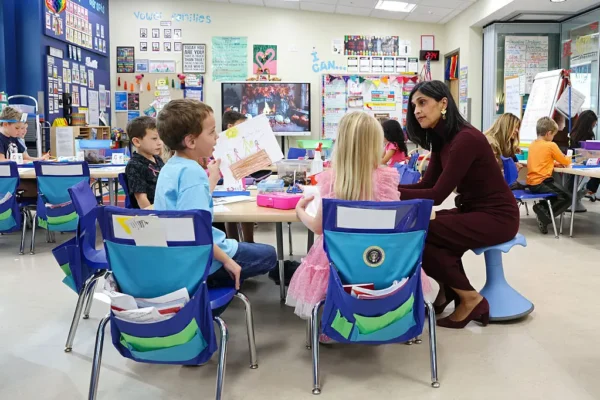 2025年11月19日,美國第二夫人烏莎・萬斯(Usha Vance)在北卡羅萊納州傑克森維爾(Jacksonville)新河海軍陸戰隊航空站(Marine Corps Air Station New River)訪問德拉利奧小學(DeLalio Elementary School)時與學生交談。(Anna Moneymaker/Getty Images)