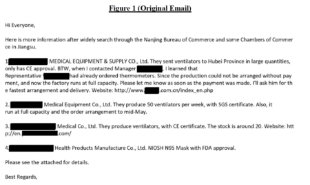 第二封電子郵件日期為2020年3月19日。江蘇省駐美東經貿代表處官員陳鑫發信給紐約州經濟發展廳,抄送孫雯,推薦四家可供應個人防護用品(PPE)的中國企業。