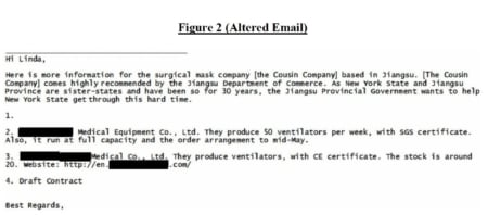 隔日(3月20日),孫雯將郵件內容重新編輯後轉發給自己:刪除原文中「透過商務局與商會蒐集資訊」的描述,將第一段改寫為:江蘇匯鴻國際集團(High Hope)同泰貿易「獲得江蘇省商務廳的高度推薦」,並強調紐約州與江蘇省是「姐妹省州」已有30年友好關係,後者盼協助紐約渡過難關。