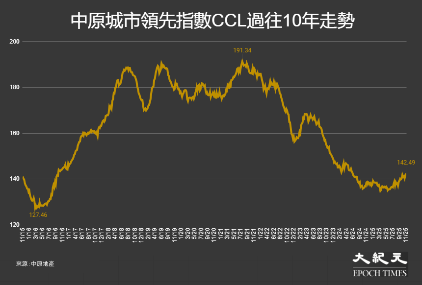 追蹤香港二手樓價的中原城市領先指數CCL於21日公布最新的數值為142.49點,截至11月16日,按周指數上升0.54%,按月則升0.99%,自疫情爆發以來(2020年1月26日起)跌19.76%,而3年的累積跌幅為12.21%。大型、中小型單位按周分別錄得上升0.59%、升0.53%,3年累積跌16.45%、跌11.29%。