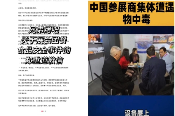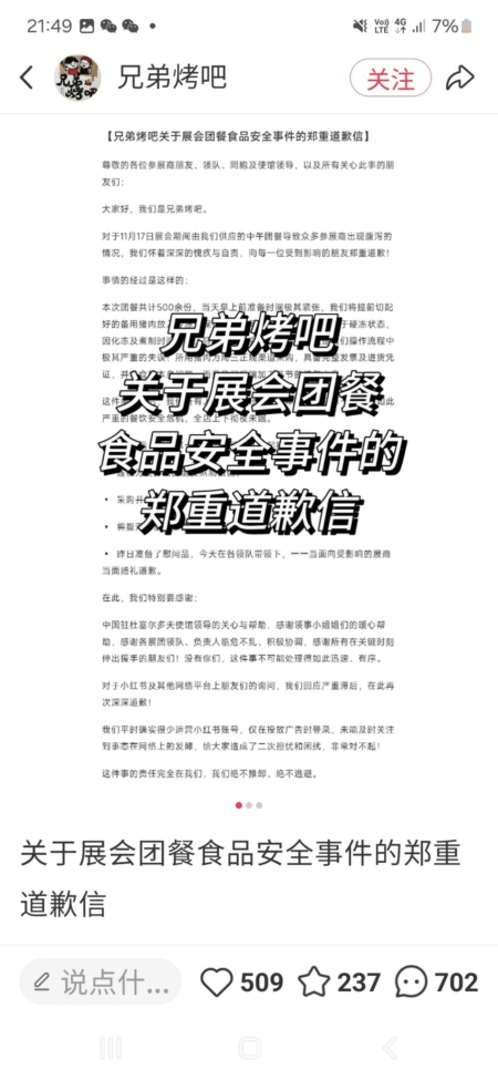 涉事中餐館「兄弟烤吧」20日在社交媒體上發出《兄弟烤吧關於展會團餐食品安全事件的鄭重道歉信》,署名日期則寫19日,承認其提供的盒飯中肉品解凍和煮制時間不足,導致大量用餐者出現不適,而他們補救的措施包括採購分發藥品,並協助將症狀較重者送醫救治。