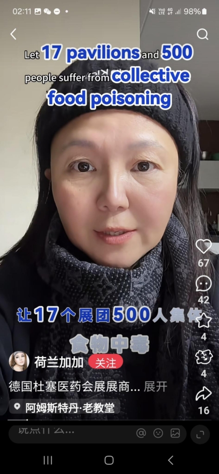 荷蘭的華裔「荷蘭加加」20日也在大陸社交平台的影片節目中說,德國杜塞醫藥會展展商17個展團5百人集體食物中毒。她批無量中餐館說,因為你人家沒有辦法正常工作,排隊上廁所,廁所紙都告急,導致的商機損失又該怎麼算?