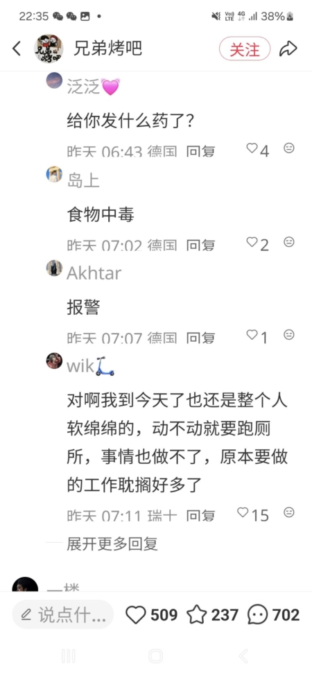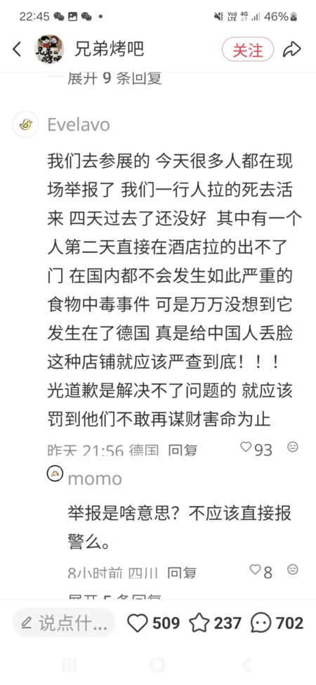 「我們一行人拉得死去活來,四天過去了還沒好,其中一個人第二天直接在酒店拉得出不了門。在國內都不會發生如此嚴重的食物中毒事件,可是萬萬沒想到它發生在德國,真是給中國人丟臉,這種店舖就應該嚴查到底!!!」