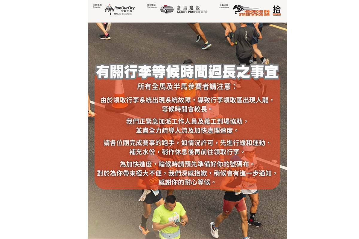 主辦單位解釋,大會今年原計劃採用新科技,透過儀器掃瞄跑手號碼布上的二維碼來定位行李,以求節省人手和加快流量。但由於系統的訊號接收出現問題,最終需要額外時間和人手將行李重新排序,大會向受影響人士致歉。
