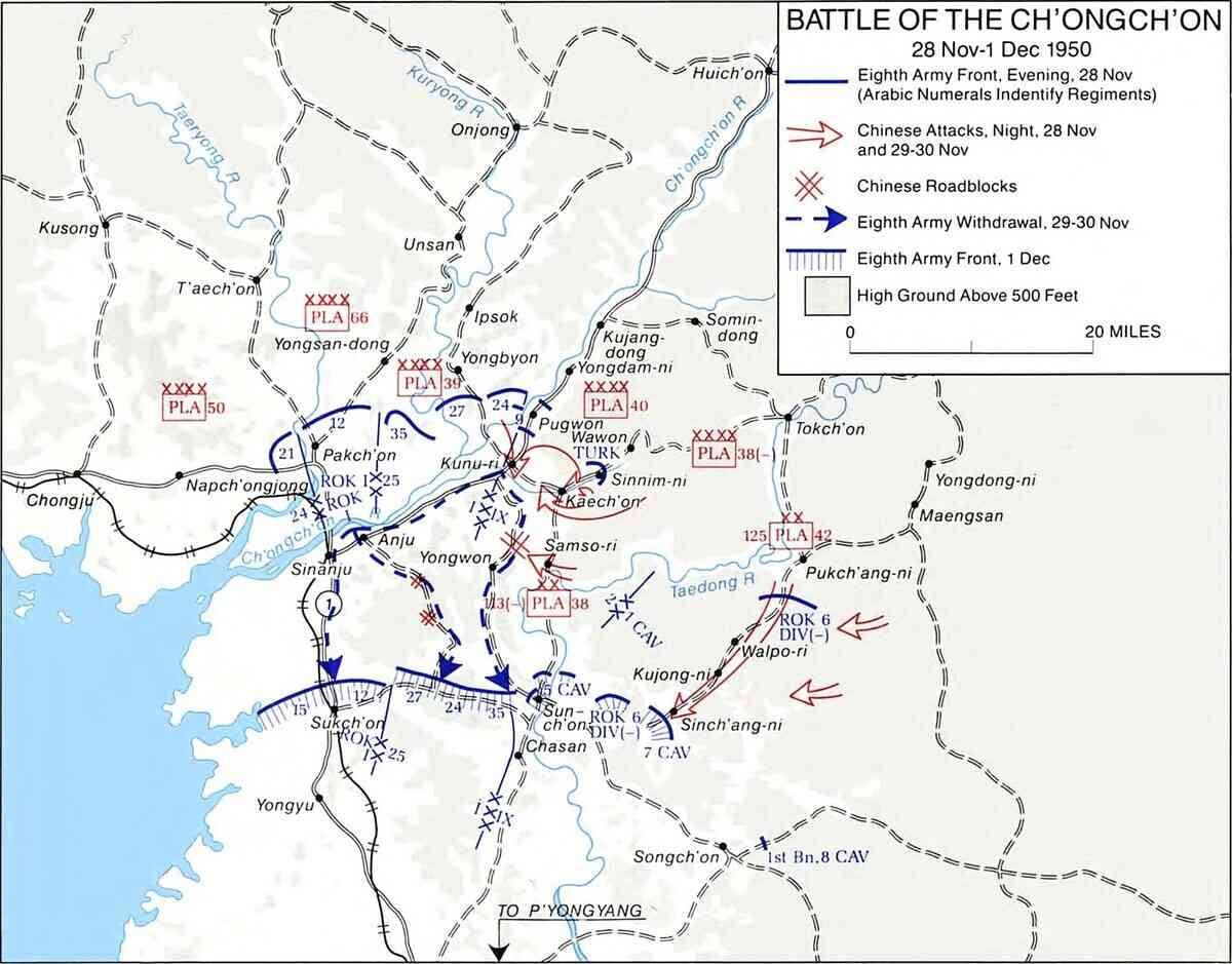 11月24日,韓國軍隊遭遇中共軍隊。11月25日黃昏,中共軍隊發動猛烈進攻,並向韓國軍隊側後迂迴。11月26日,韓國軍隊向後撤退,但遭遇中共軍隊伏擊,韓國倖存部隊只能與美軍會合,聯合國軍失去右翼防護。