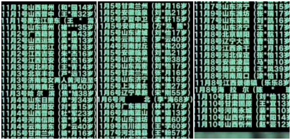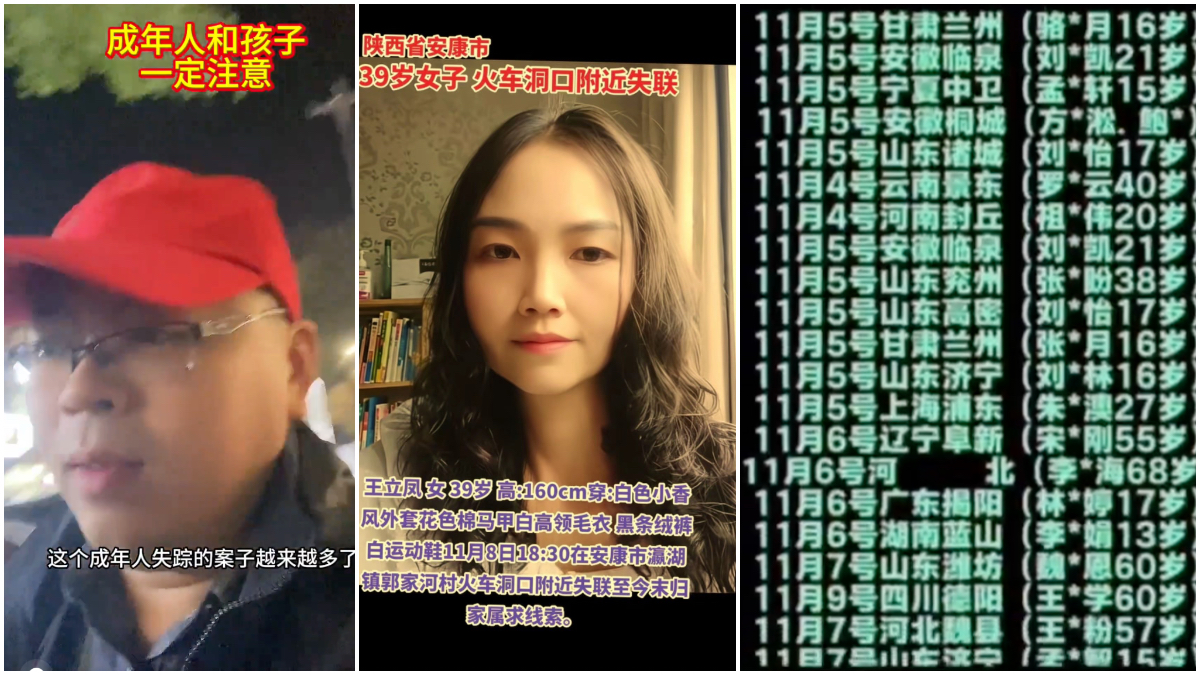 大陸網民統計了一份從抖音等自媒體平台搜集的「失蹤人口名單」,發現從11月1日到10日,僅10天就有逾百人失蹤,絕大部份是十多歲的年輕人,也有三四十歲的成年人。